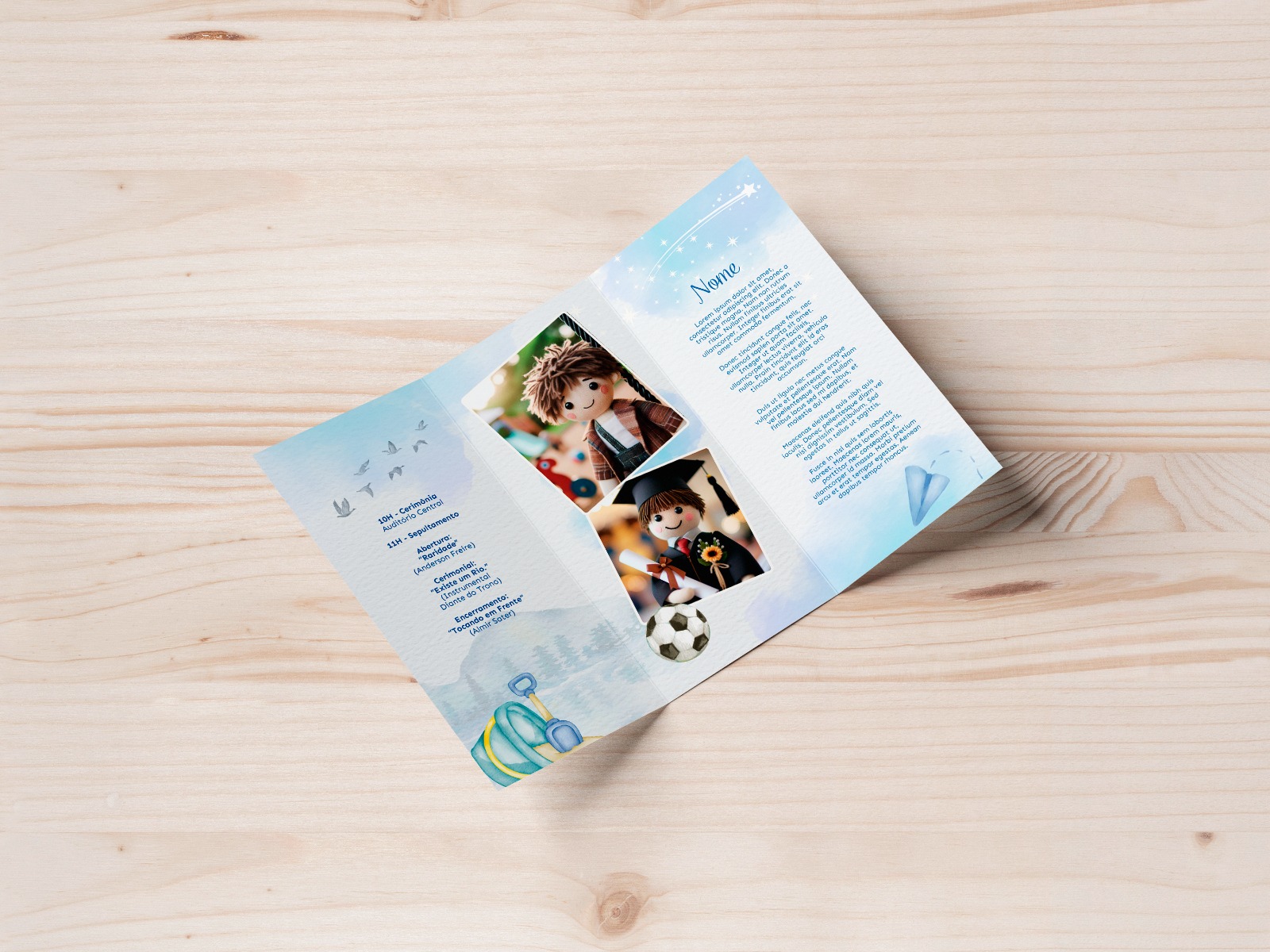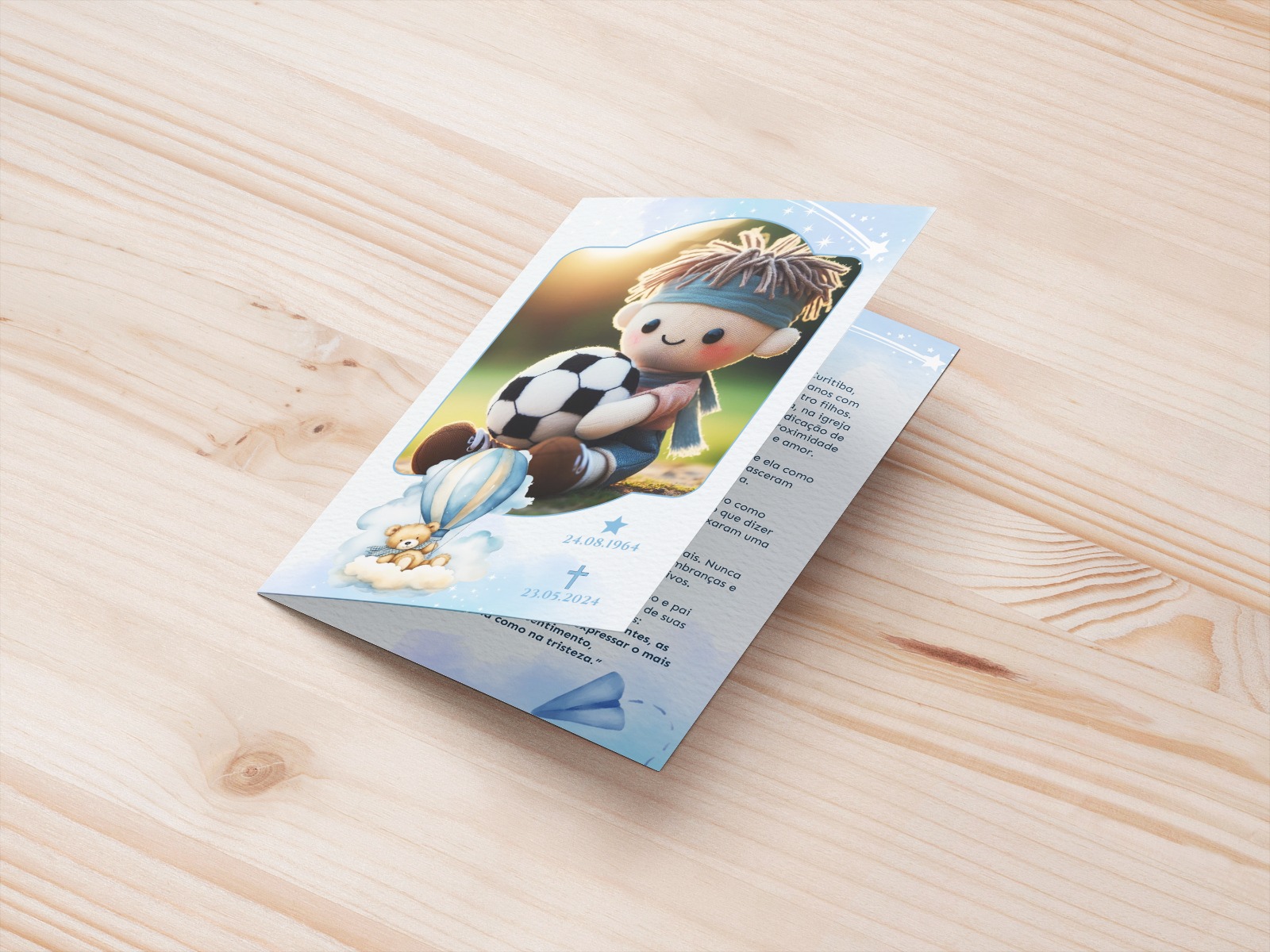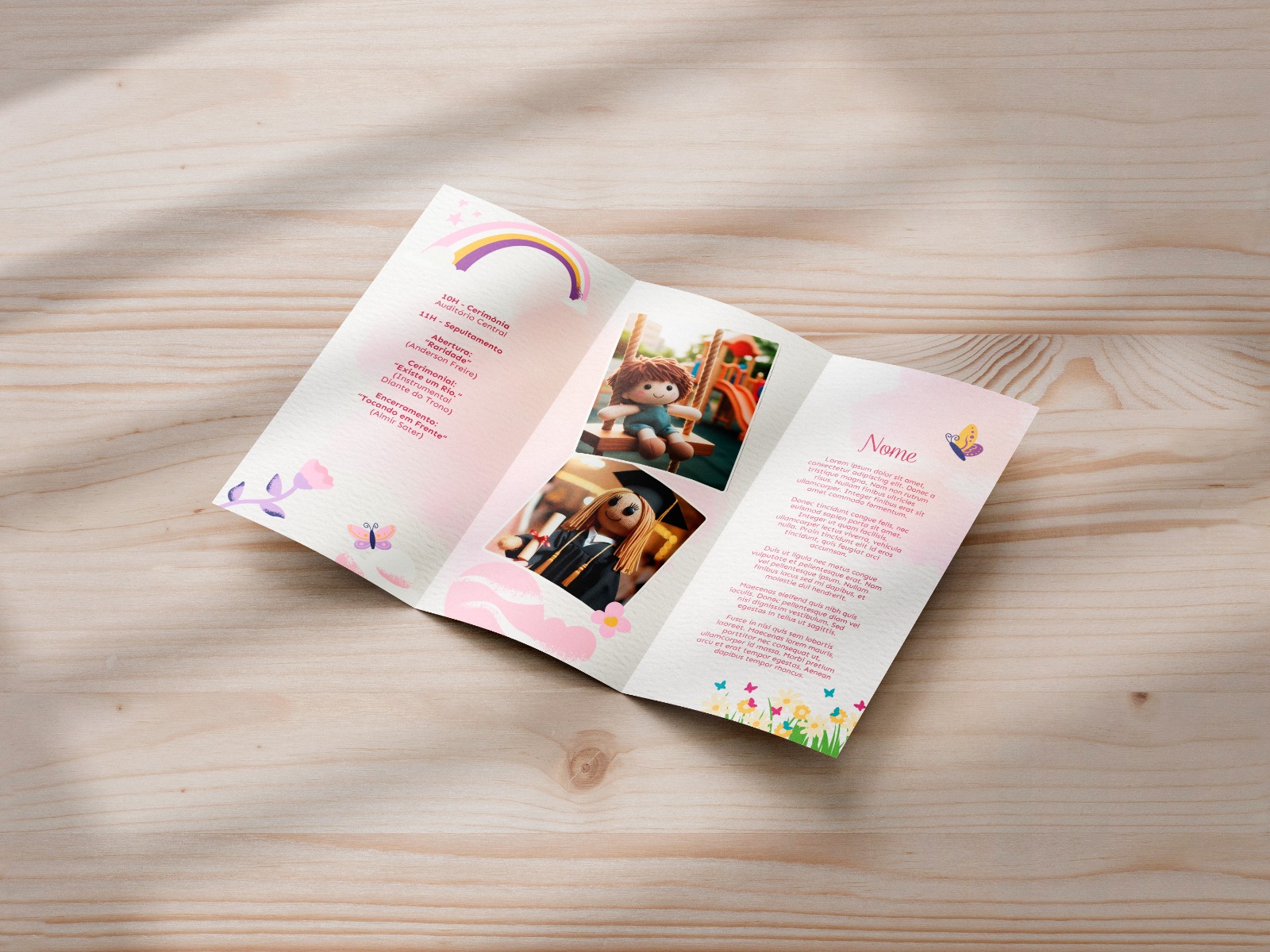 Com design único, incluindo informações e fotos do falecido, juntamente com um cronograma detalhado da cerimônia.